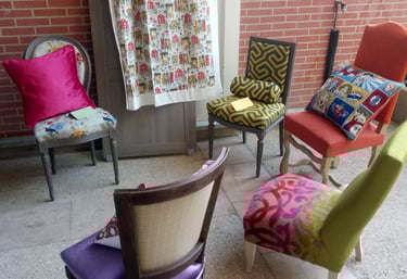 Rénovation soignée de chaises et canapés ainsi que la confection des éléments de décor ( coussins, housses, rideaux, voilages) pour un intérieur élégant.